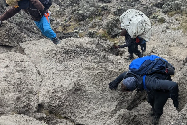 • Leave Barranco and continue on a steep ridge up the Barranco Wall, through the Karanga Valley (lunch at 4200m / 13,779 ft), and the junction which connects with the Mweka Trail.
